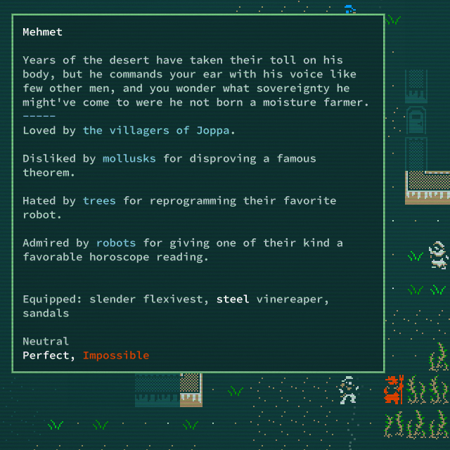 Play the role of a mutant from the salt-spangled jungles of Qud, or play as a true-kin descendant from one of the few remaining eco-domes: the toxic arboreta of Ekuemekiyye, the ice-sheathed arcology of Ibul, or the crustal mortars of Yawningmoon.